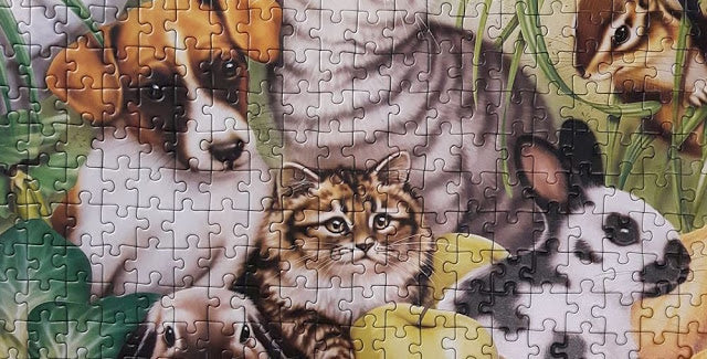 Bienvenue dans le monde aventureux des puzzles découpés au hasard ! Nos pièces de planche bleues épaisses aux formes originales ajoutent beaucoup de caractère au puzzle standard. Les formes amusantes sont une rupture avec les motifs prévisibles d'un puzzle découpé en ruban. Quelle est la différence? Un puzzle coupé en ruban a des pièces toutes de formes carrées similaires qui s'alignent dans des colonnes et des rangées nettes créant une grille. Vous verrez un modèle du même nombre de "innies" et "outies". Un puzzle coupé au hasard a des pièces uniques sans rime ni raison pour les innies et les outies. Les pièces peuvent être longues, courtes, larges, fines ou sinueuses et lorsque le puzzle est terminé, il a généralement un motif abstrait . Vous pouvez même vous retrouver fasciné par les formes particulières. Regardez toutes ces pièces farfelues, ne sont-elles pas amusantes ?