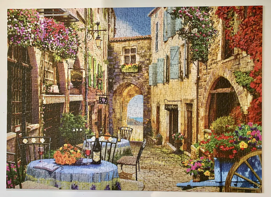 Cette petite rue tranquille dans un village côtier français est le rendez-vous parfait. Des fleurs fraîches, un verre de vin et une table privée vous attendent dans ce puzzle élégant et romantique.