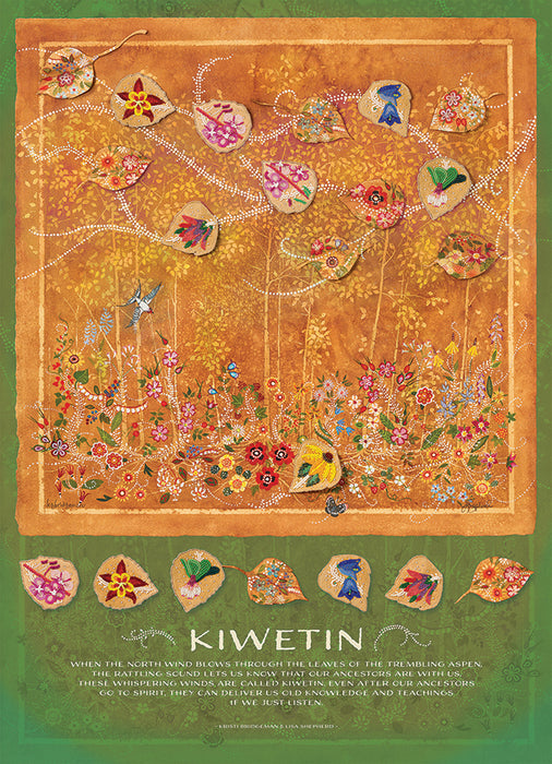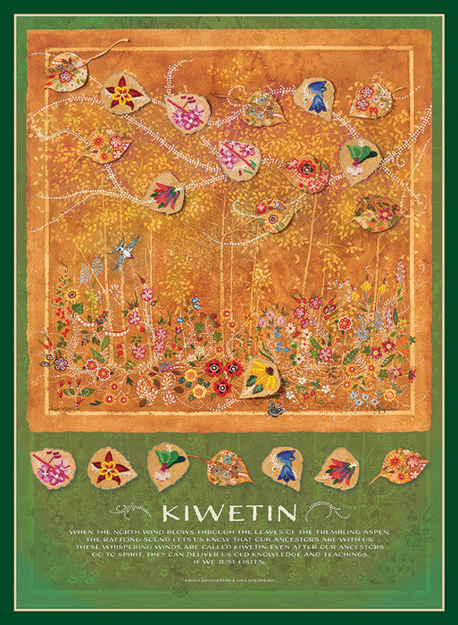 Lorsque le vent du nord souffle dans les feuilles du tremble, le cliquetis nous fait savoir que nos ancêtres sont parmi nous. Ces vents murmurants sont appelés Kiwetin. Même après leur retour à l'Esprit, nos ancêtres peuvent nous transmettre d'anciens savoirs et enseignements, si seulement nous les écoutons.