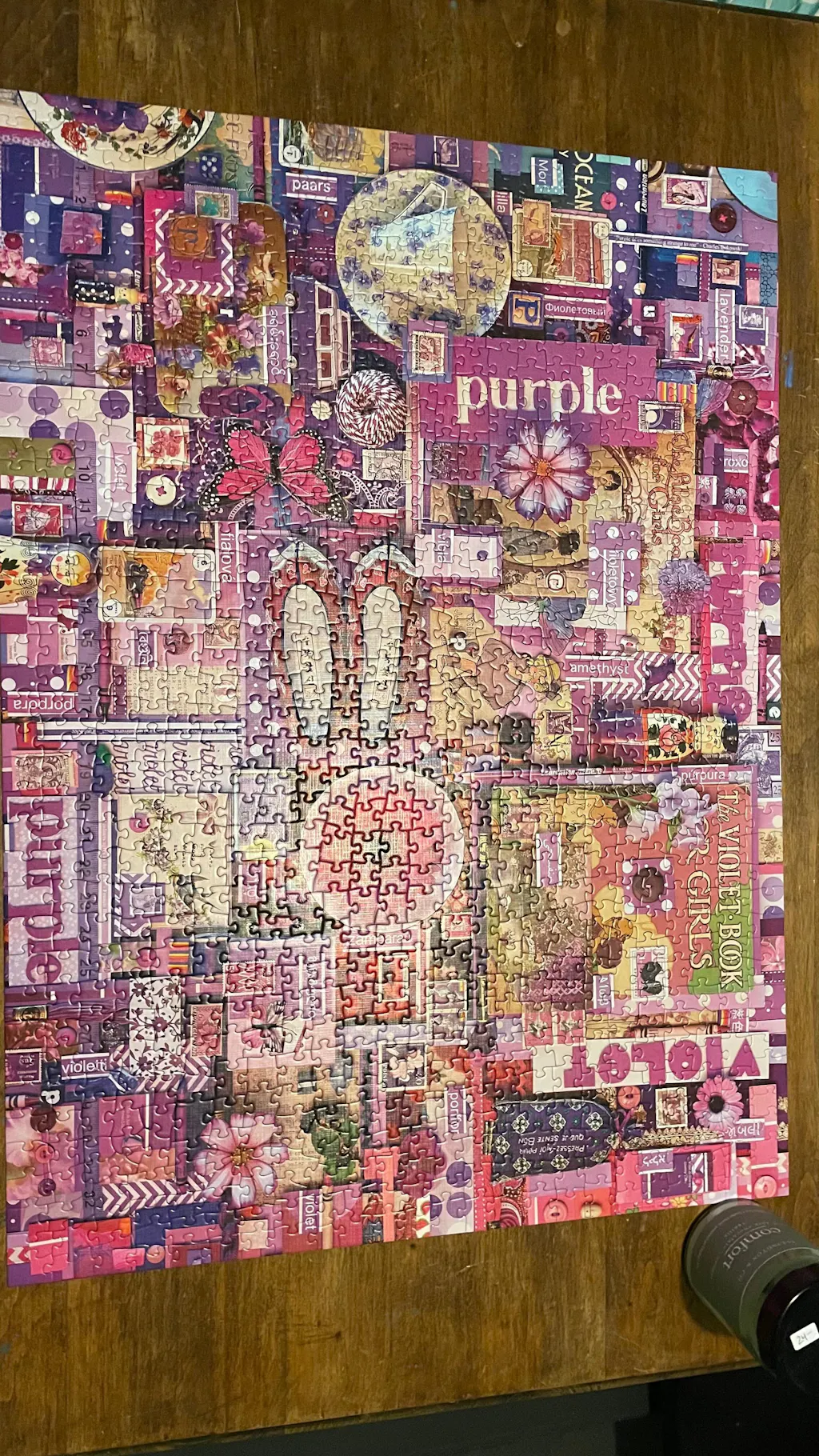 This special 1000 piece puzzle by artist Shelley Davies celebrates all things Purple. It's one in a series of seven puzzles that make up a rainbow theme when all are completed and aligned next to each other, spanning 15.5 feet. Ribbons of the word, "purple" are spelled out in multiple languages, along with vintage knick knacks and a pencil with the artist's name on it. Purple, indigo, or violet, however one calls it, this puzzle is full of majesty. The Rainbow Collection is a unique puzzle designed and photographed exclusively for Cobble Hill in Victoria, BC.