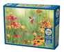 The Rufous Hummingbird is attracted to the pretty flowers in the tall grass. What a glorious sunny day for all the birds that are out to play!